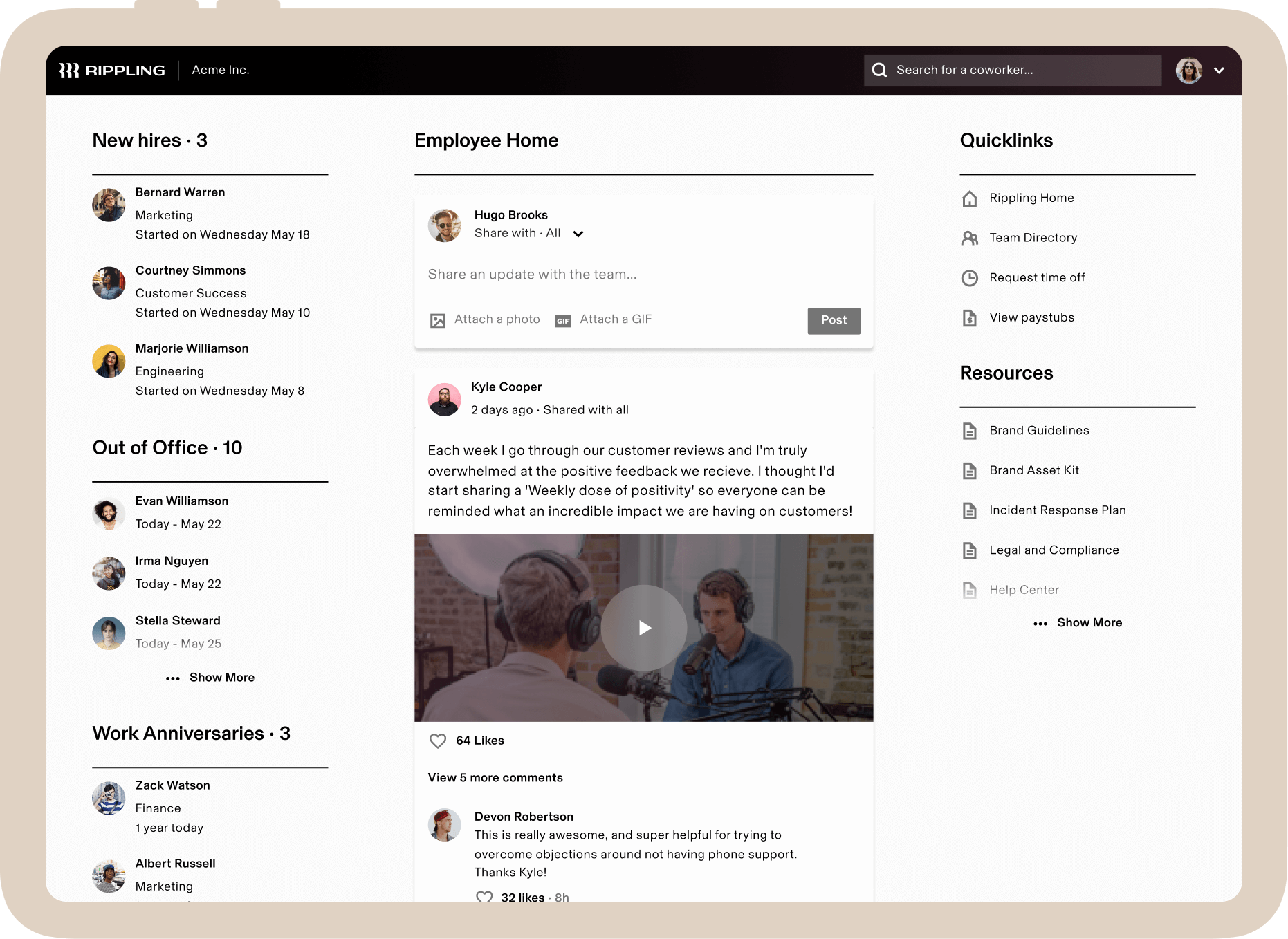 Stay up to date with all employee happenings: birthdays, new hires, OOO statuses, and centralized resources.