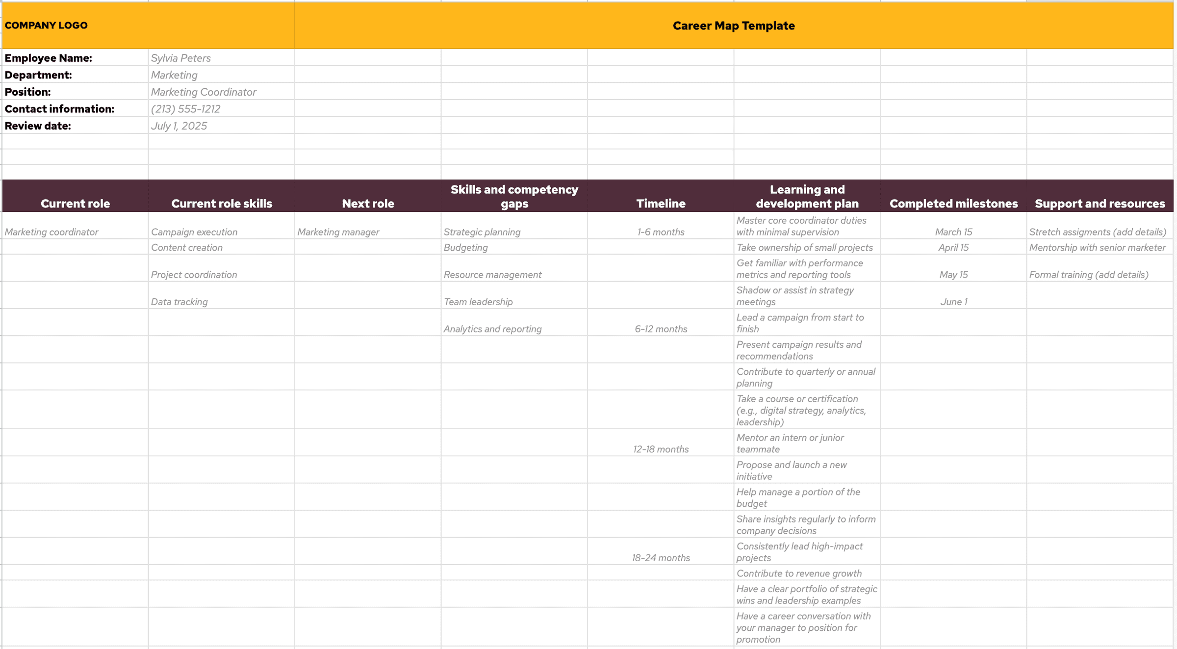 Make it visual and easy to follow. Whether it’s a flowchart, timeline, or simple diagram, the career map should be something employees can reference and understand at a glance. Or use the template provided above to give yourself a head start. Ensure the final version is well-organized, easy to access, and accessible to everyone.