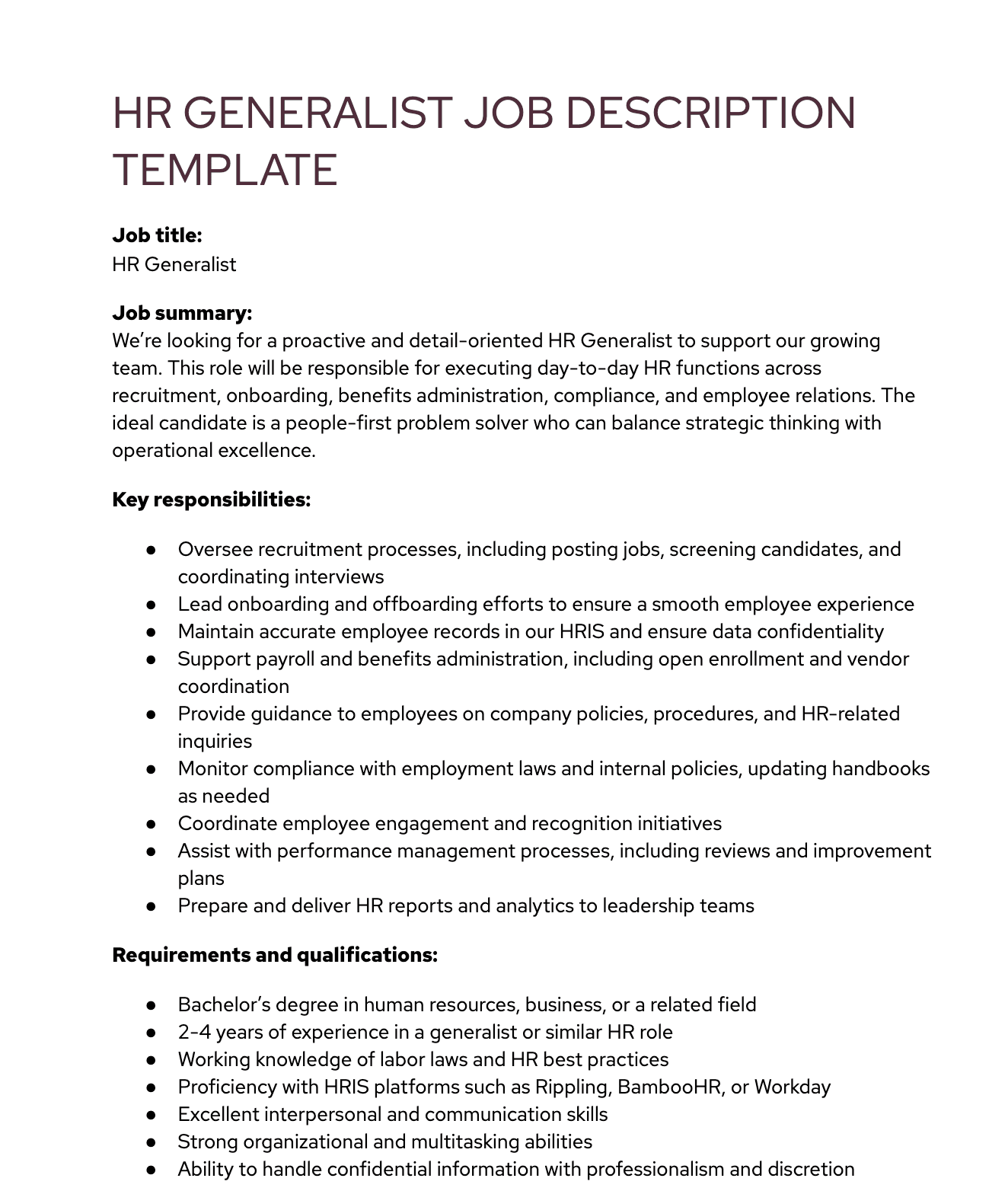 When writing any job description, it’s important to outline the key responsibilities, requirements, and skills needed to succeed in the role. Use this customizable job description template to help you attract qualified candidates for your HR generalist role.
