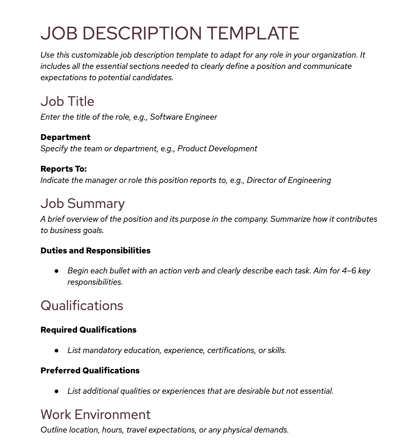 A complete job description should cover the following components: a specific and searchable job title, a brief but informative summary of the position, a detailed list of duties and responsibilities written with action verbs, required and preferred qualifications, working conditions (including physical demands or travel), compensation and benefits, and the role’s reporting structure. These elements help set expectations, reduce hiring mistakes, and ensure role clarity throughout the employee lifecycle.