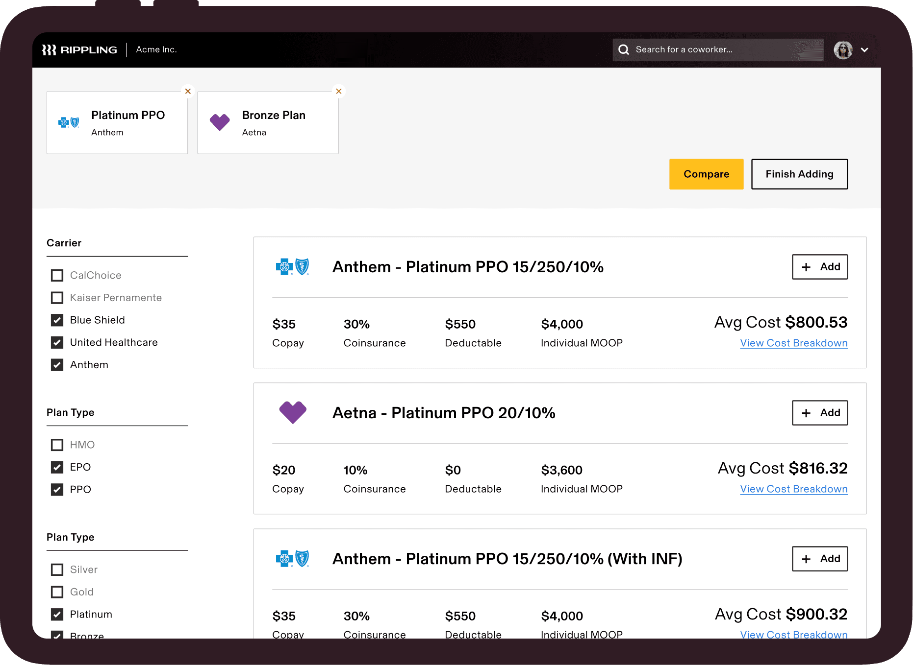 Rippling centralizes your client management so you can quote new plans, view open enrollment statuses, and more—all in one place.