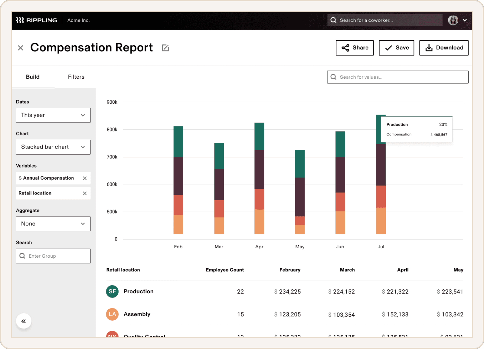 Rippling’s powerful, easy to use reporting engine gives your team the insight they need to make smart staffing decisions and provide detailed audit logs for compliance purposes.
