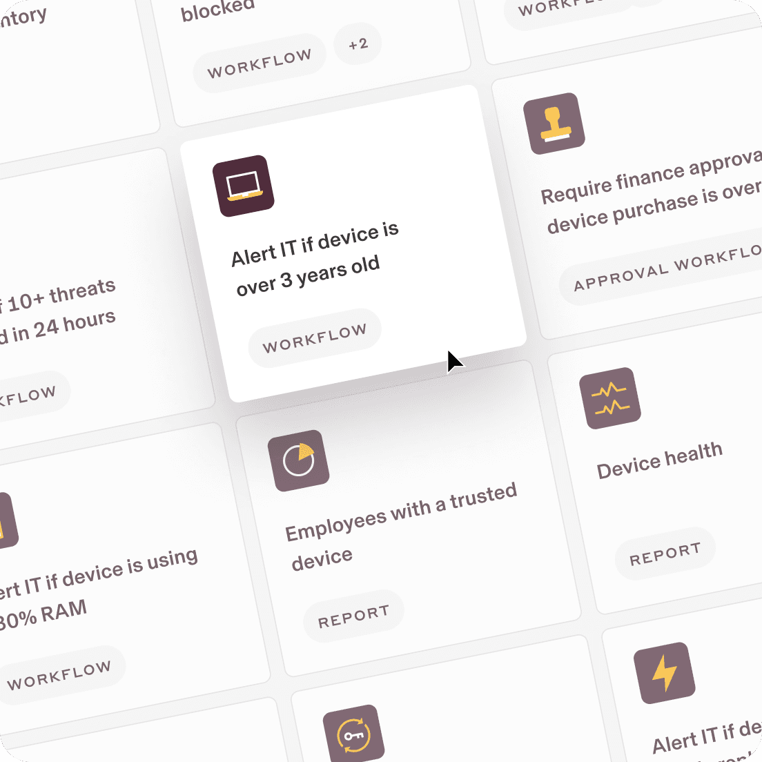 Take the effort out of IT with custom workflows, dynamic permissions and policies, and rich reports for users and devices.
