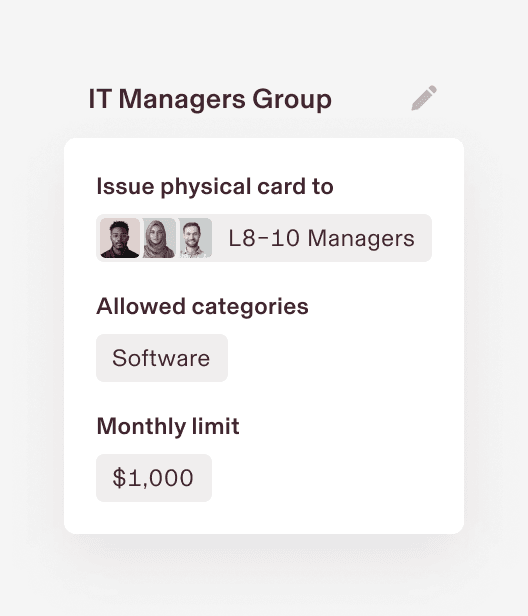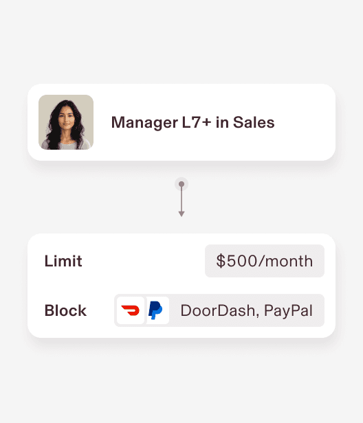 Set spending limits by role and department. Limits update automatically as your org chart changes.